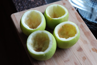- Slice top from apples and core the apples placing flesh in a bowl. After coring, brush inside of apples with 2 tbs lemon juice.