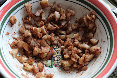 Add honey, cinnamon, sugar and walnut to apple flesh. Mix.