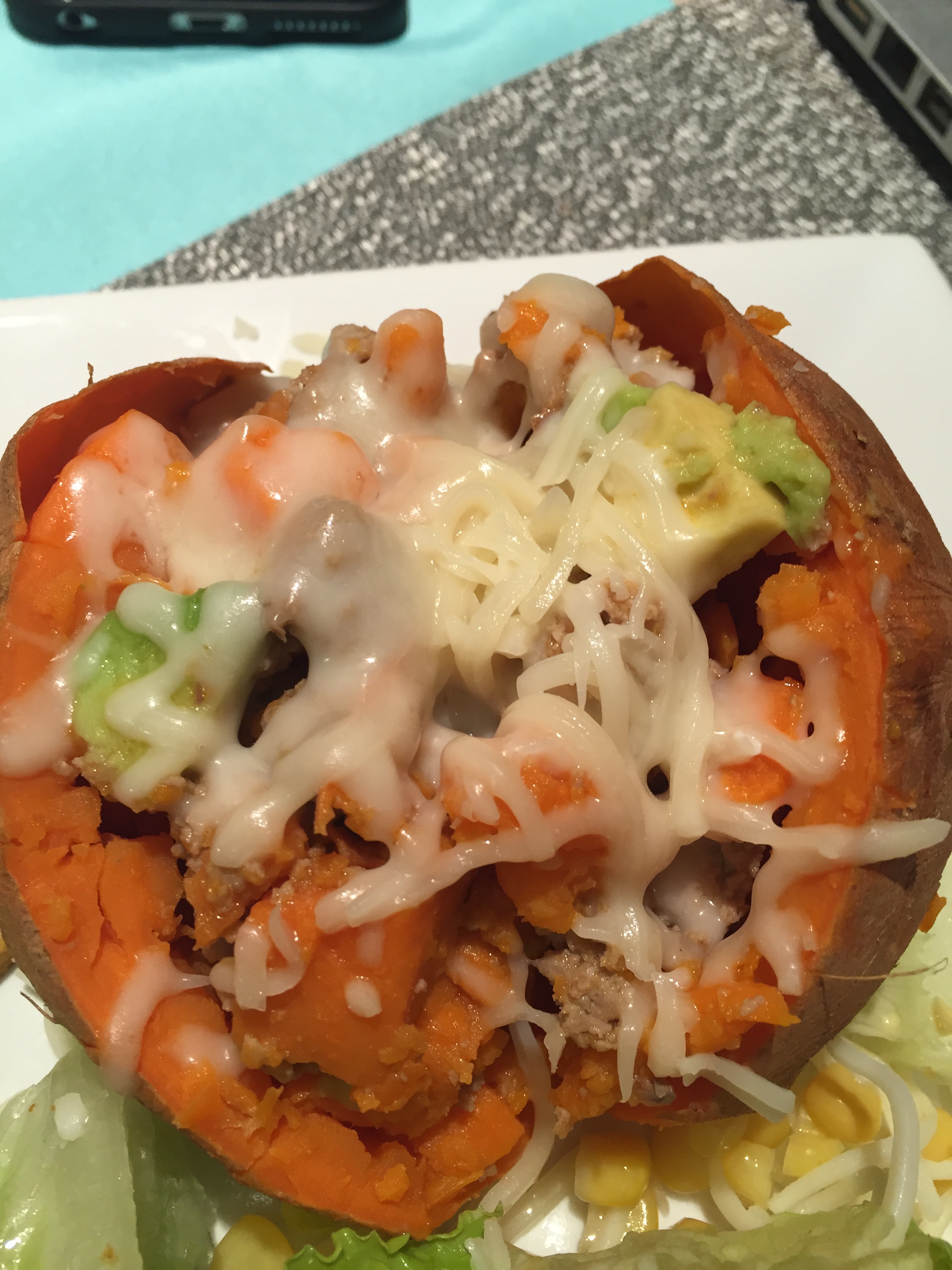 - Poke holes in the sweet potato and place in the over for 45 minutes or until soft (you can also heat in the microwave for a quicker meal)