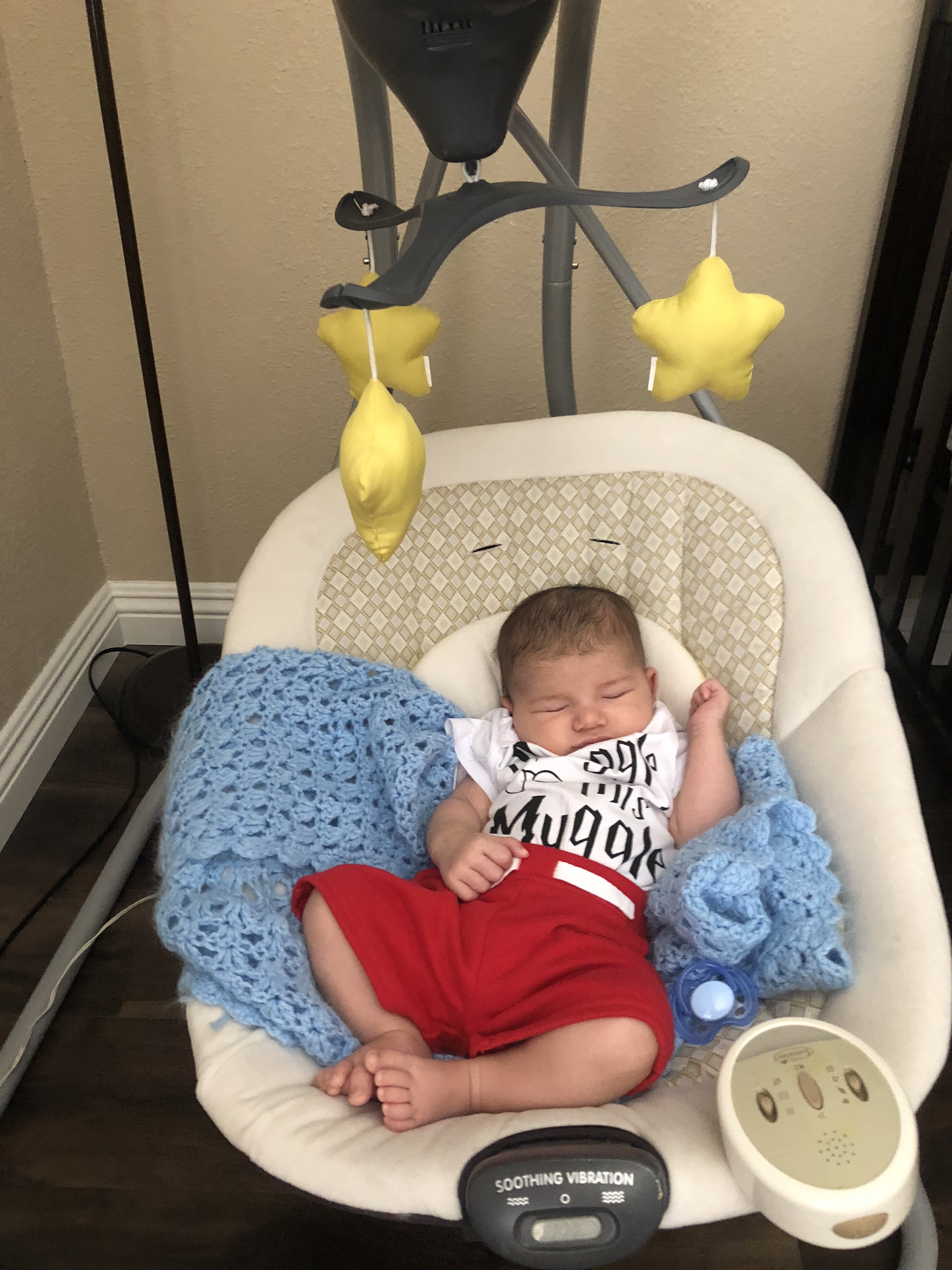 Baby in swing first week of parenthood