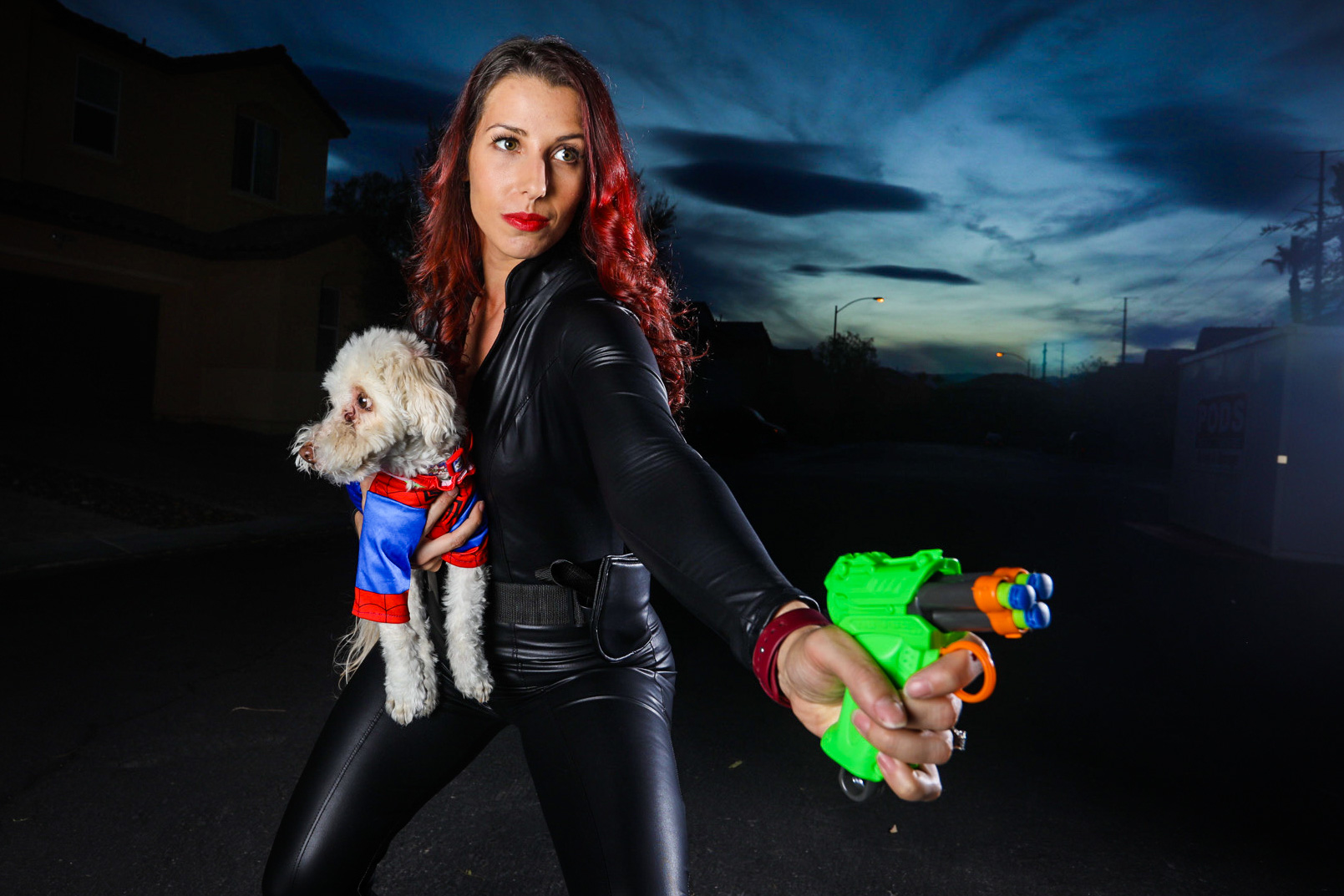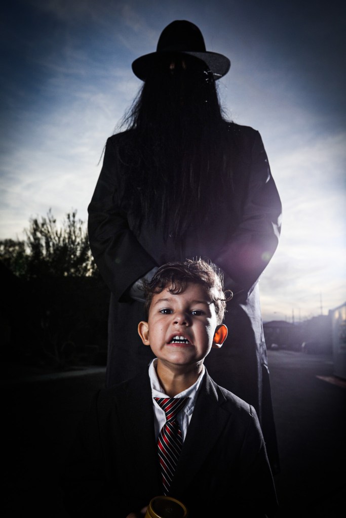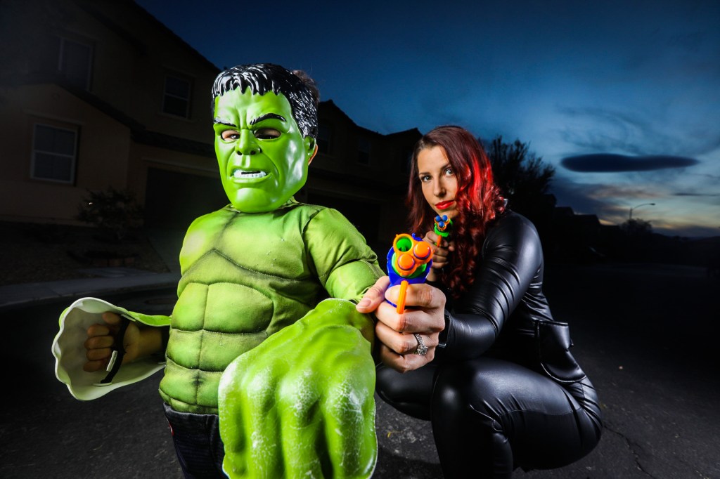 A Halloween photoshoot doesn’t have to be complicated. Use the space that you already have! We do our annual shoot right in front of our house. We set up the lights and camera and roll through different scenes in our outfits. My son gets a kick out of using props for his photos too and really gets into character.